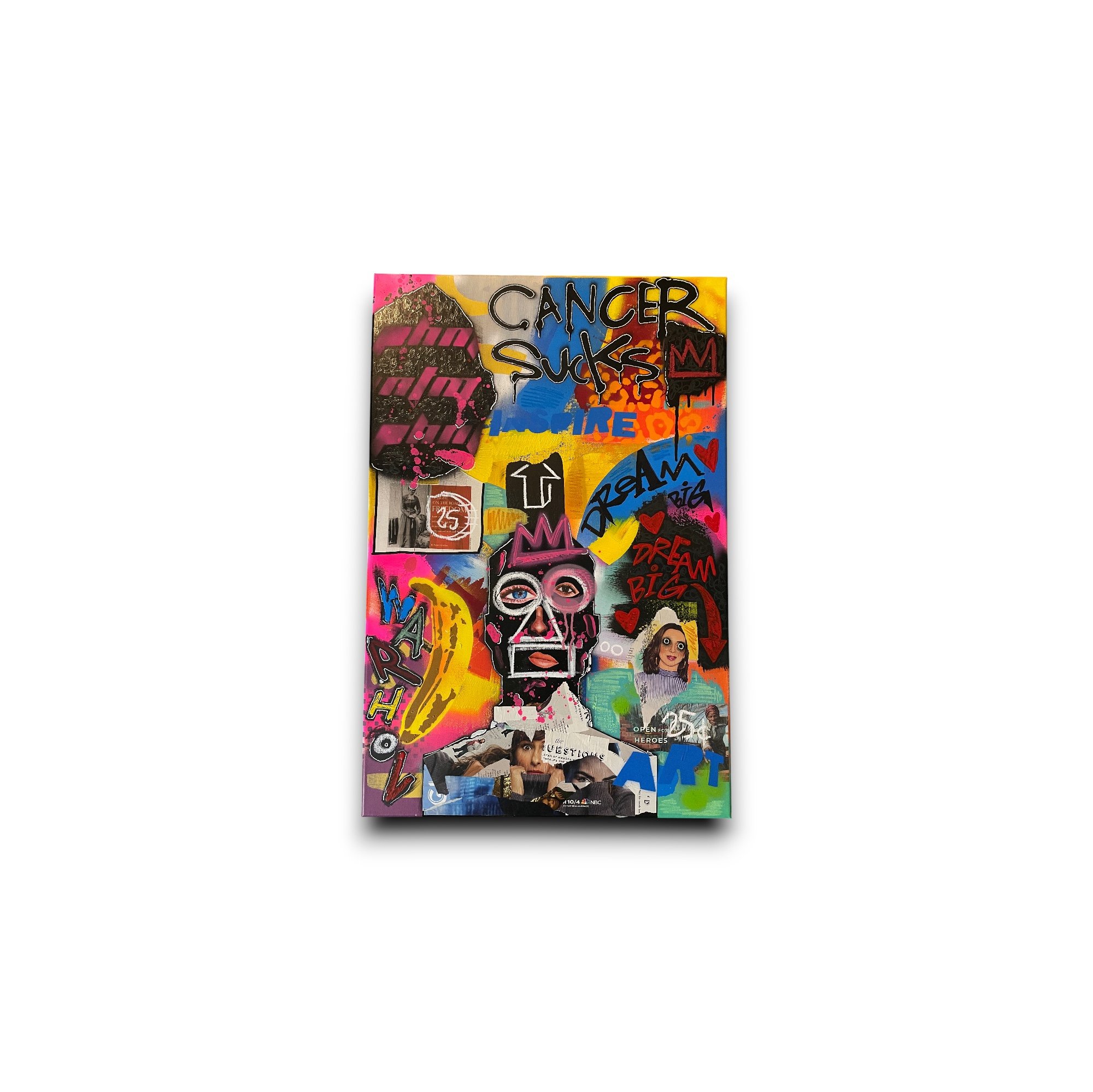 Cancer Sucks is an original abstract painting that blends geometric design with street-inspired texture. Bold shapes and layered colors collide in a composition that feels both structured and spontaneous. Every mark, fade, and overlay adds to the rhythm of controlled chaos — making this piece a striking statement for any space.