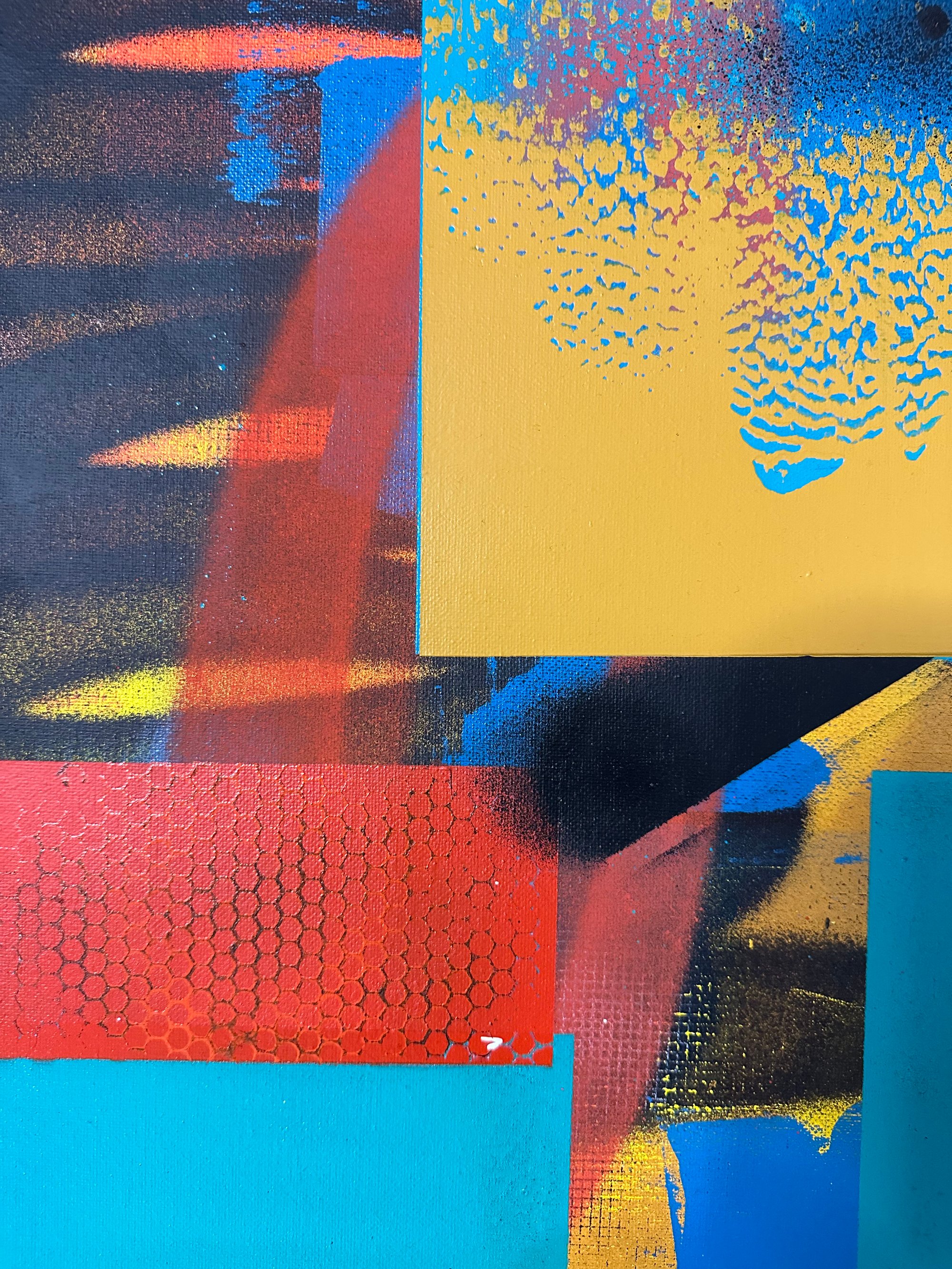 Electric Dus explores rhythm, balance, and disruption through geometric abstraction and layered spray textures. The piece is a visual dialogue between order and spontaneity — where structured blocks of color meet the organic imperfections of aerosol gestures. Each section pulses with its own energy, creating a coded language of hue and form that challenges perception and harmony.