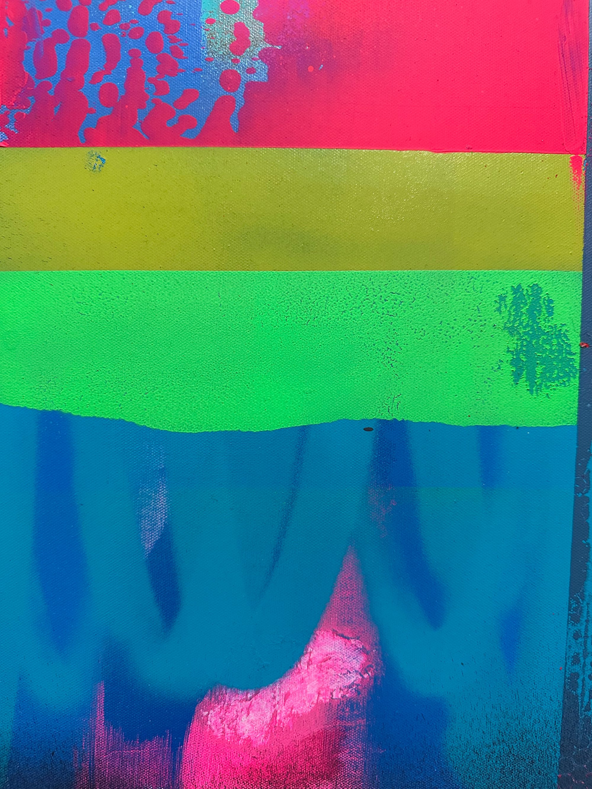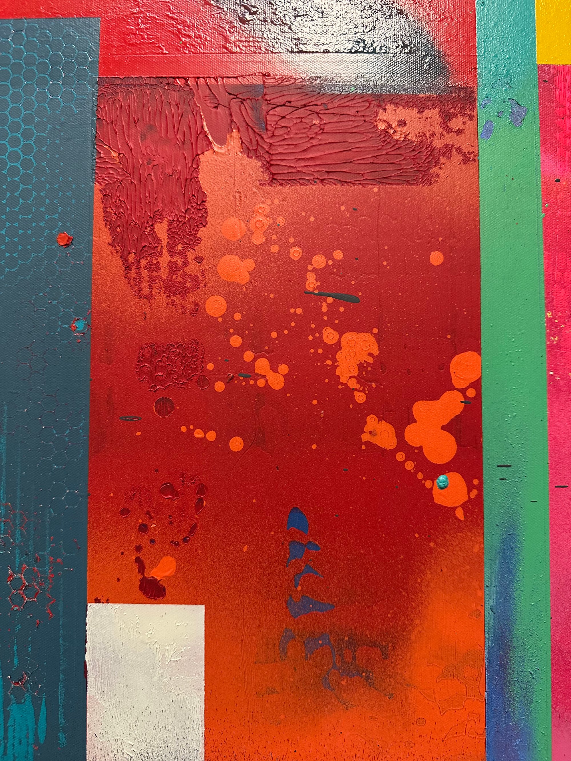 Fragmented Prism explores rhythm, balance, and disruption through geometric abstraction and layered spray textures. The piece is a visual dialogue between order and spontaneity — where structured blocks of color meet the organic imperfections of aerosol gestures. Each section pulses with its own energy, creating a coded language of hue and form that challenges perception and harmony.