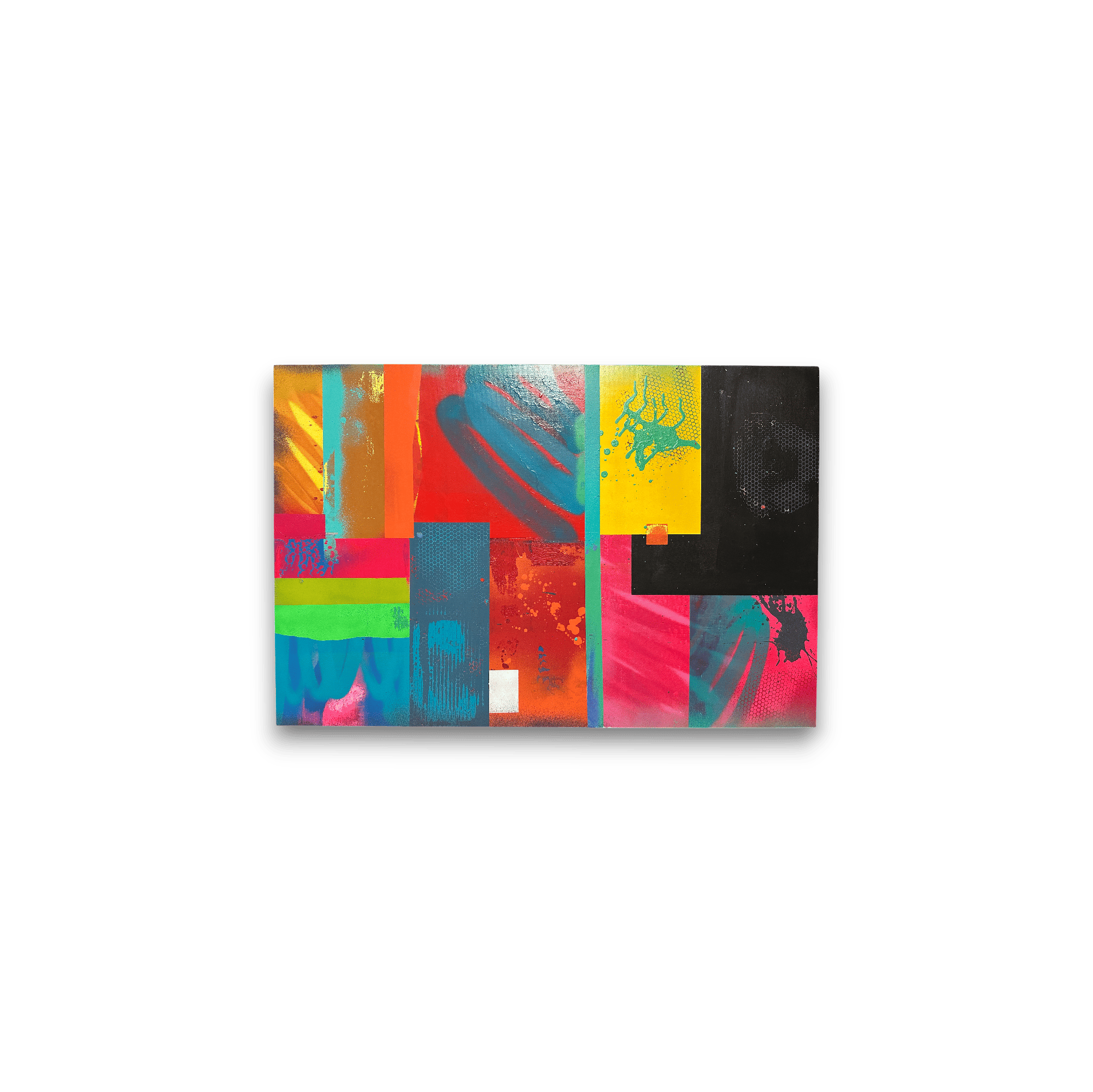Fragmented Prism is an original abstract painting that blends geometric design with street-inspired texture. Bold shapes and layered colors collide in a composition that feels both structured and spontaneous. Every mark, fade, and overlay adds to the rhythm of controlled chaos — making this piece a striking statement for any space.
