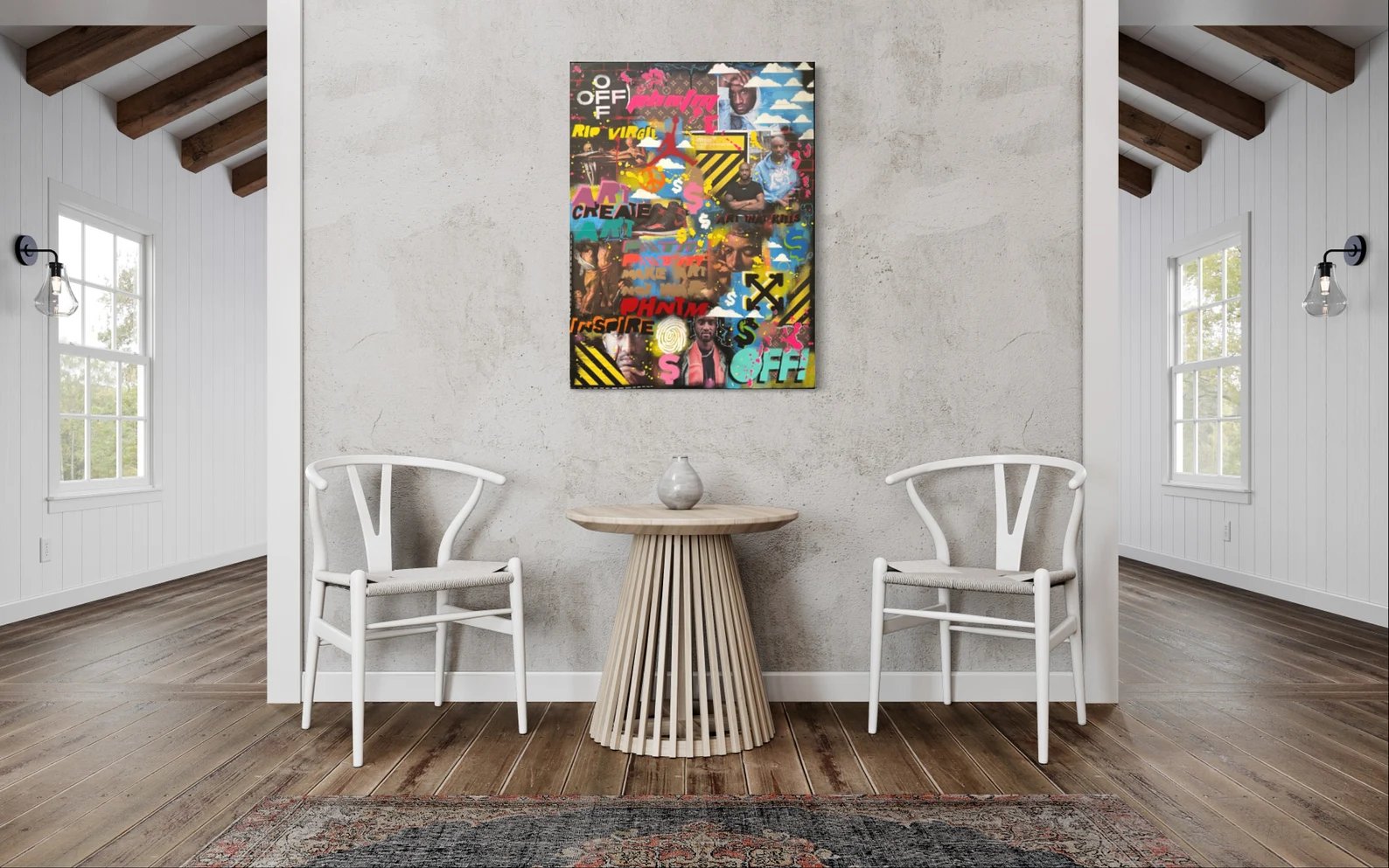 Industrial Dreams is an original abstract painting that blends geometric design with street-inspired texture. Bold shapes and layered colors collide in a composition that feels both structured and spontaneous. Every mark, fade, and overlay adds to the rhythm of controlled chaos — making this piece a striking statement for any space.